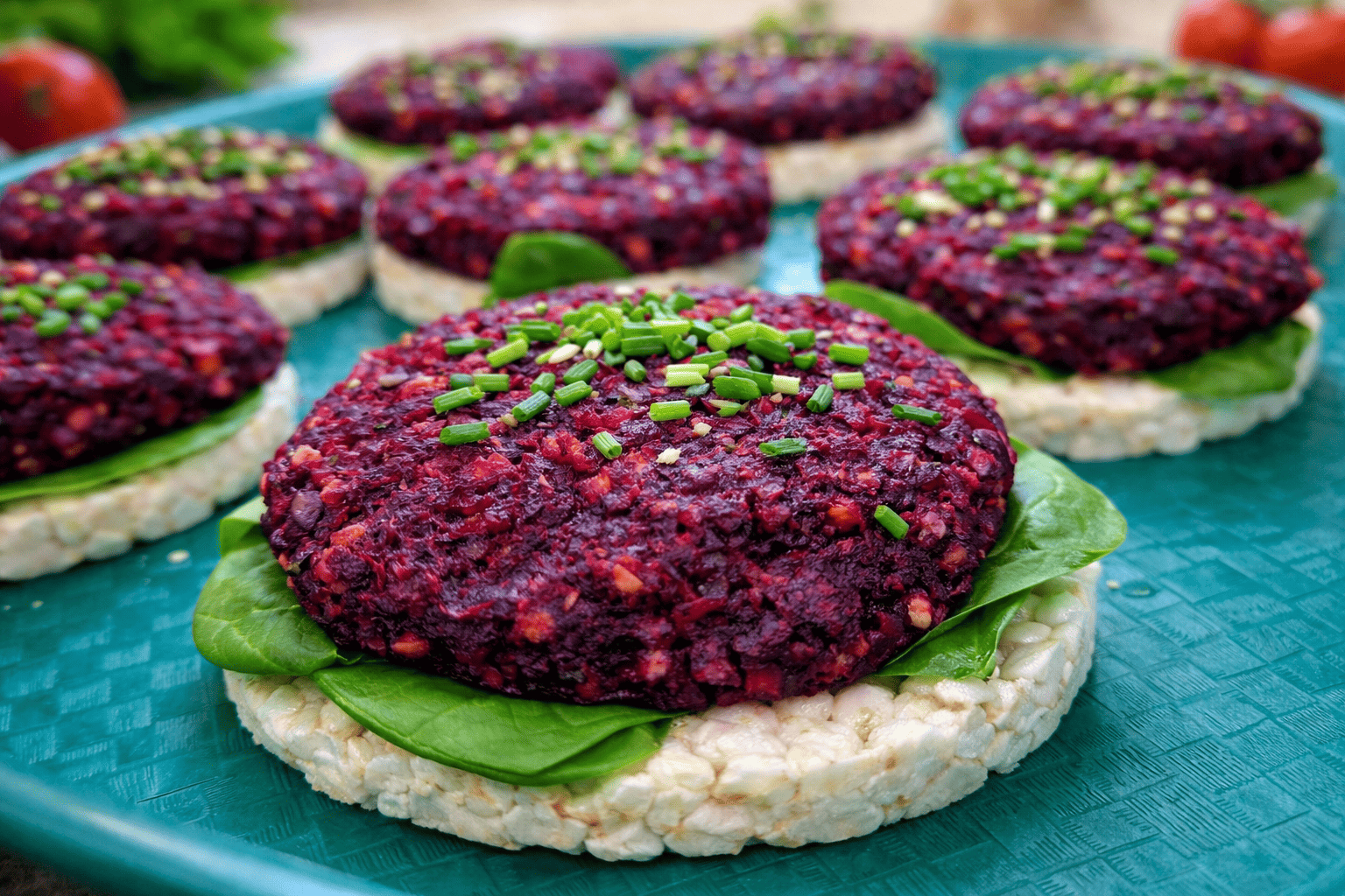 Buraczane burgery zostały podane na lekkim waflu ryżowym ze świeżym listkiem szpinaku, tworząc kolorowy, zdrowy i smaczny podwieczorek.