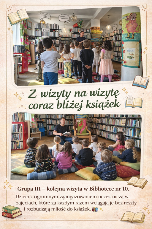 Zajęcia prowadzone w bibliotece angażują dzieci w pełni – z dużym zainteresowaniem słuchają czytanych historii, aktywnie uczestniczą w proponowanych aktywnościach i z radością podejmują nowe wyzwania. Widać wyraźnie, że kontakt z książką sprawia im ogromną przyjemność i rozwija ich wyobraźnię.